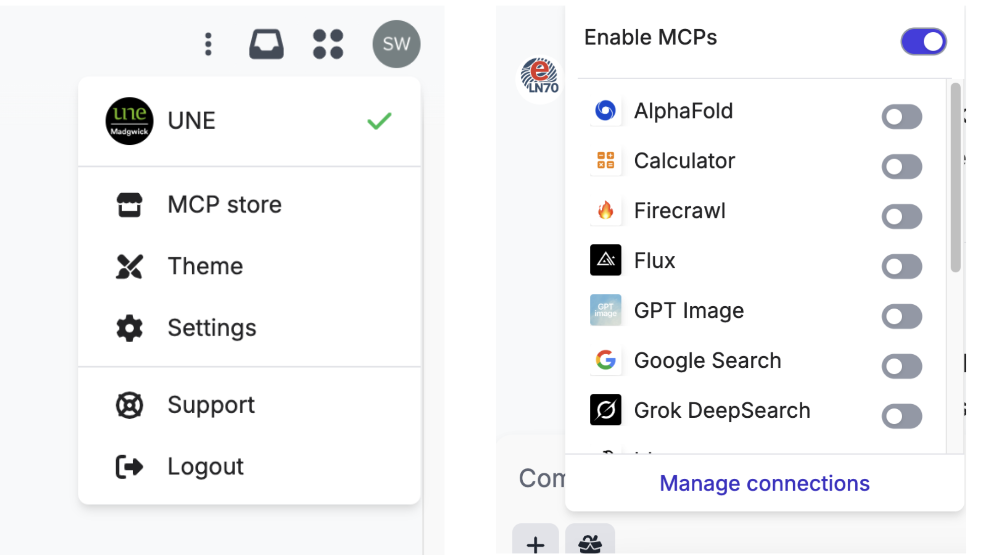 Click on your initials in the top right, and the MCP Store link at the top of the drop-down, OR use the Box icon in the bottom left of your chatbox, and click Manage Connections.